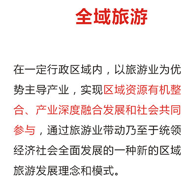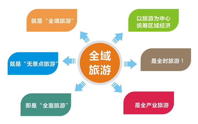 全域旅游就是“全境旅游”、以旅游为中心统筹区域经济、是全时旅游、是全产业旅游、即是“全面旅游”、就是“无景点旅游”、就是“全境旅游”。