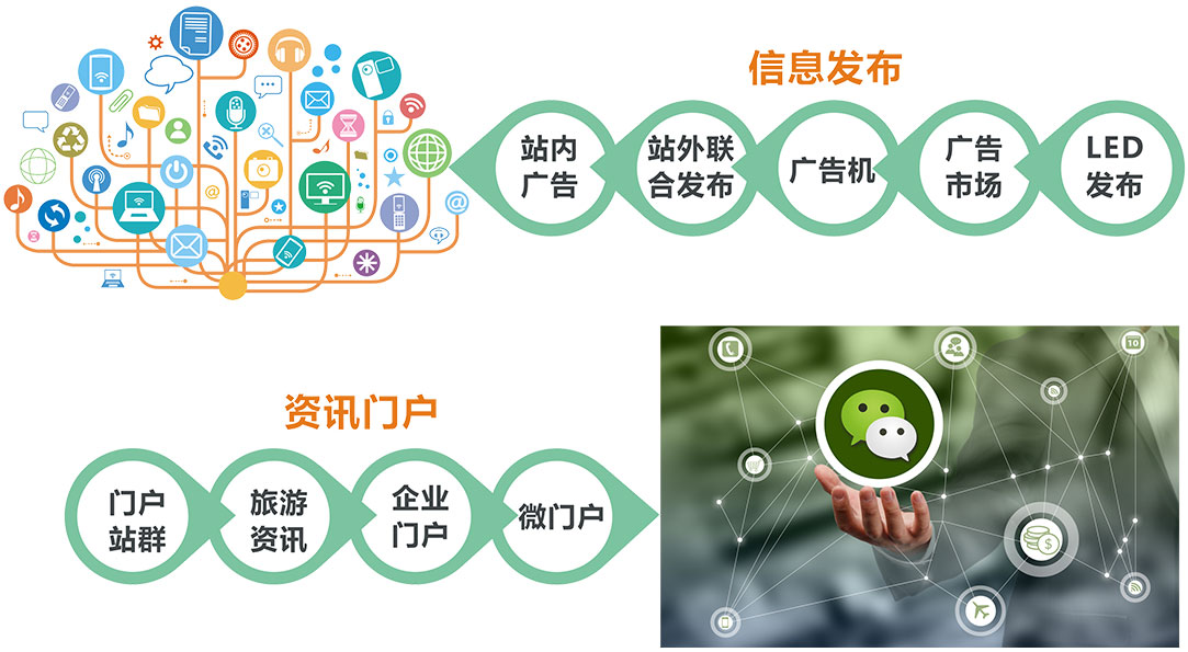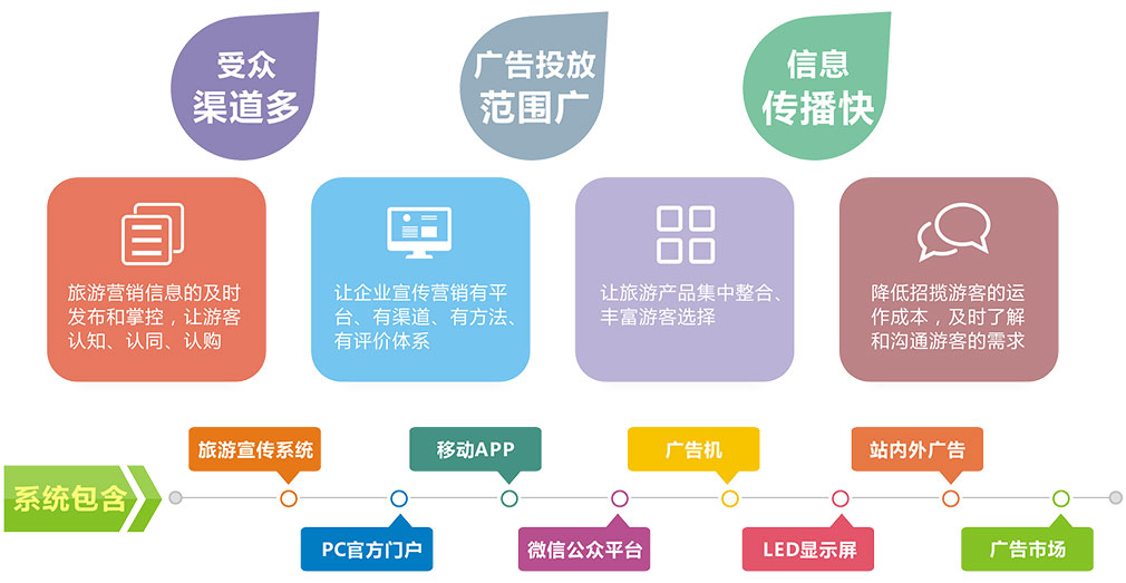 全域旅游全媒体营销平台建立统一部署、统一标准、统一规范、统一管理的“网站群”,实现游客通过PC端、移动端、APP的防问,统一游客入口;通过媒体发布矩阵,实现目的地旅游信息能够发布到自助终端与站外媒体,信息主要包括旅游资讯、旅游商品、公共服务等。